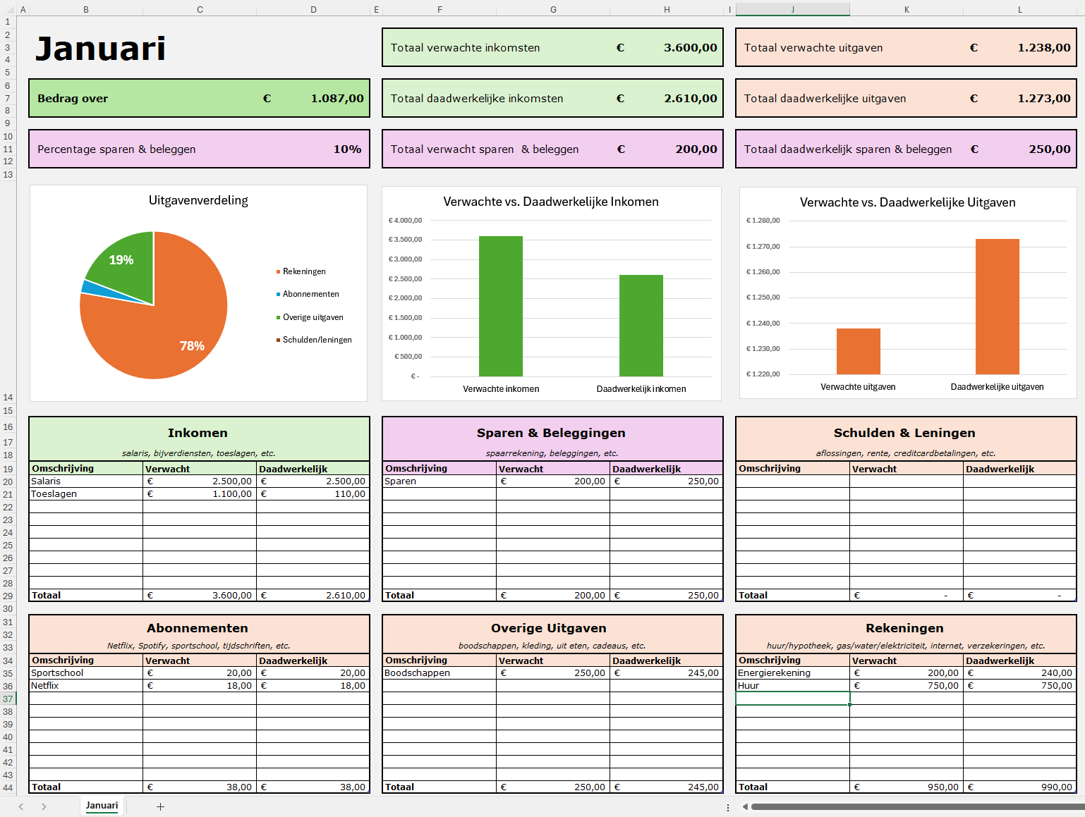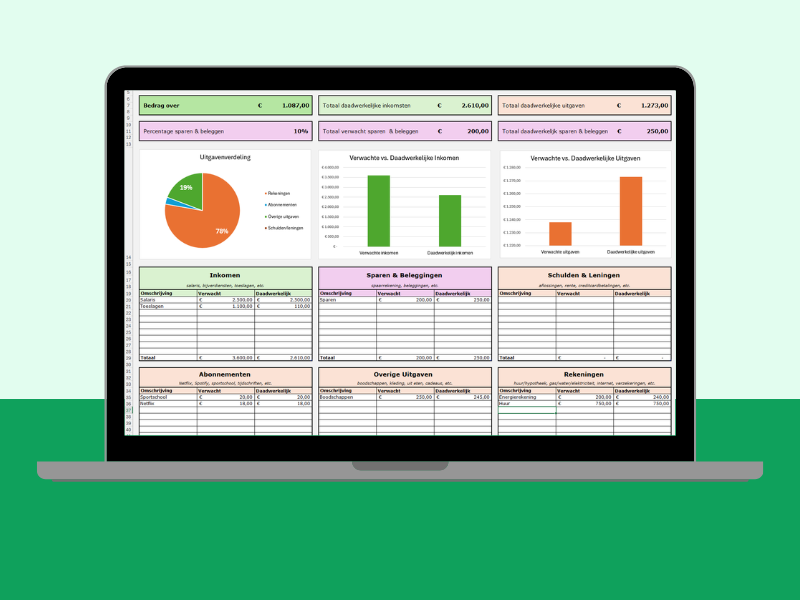 Beheer je budget eenvoudig in Excel met deze budgetplanner. Je hoeft alleen je verwachte en daadwerkelijke inkomsten en uitgaven in te voeren. De ingebouwde formules en grafieken doen de rest.