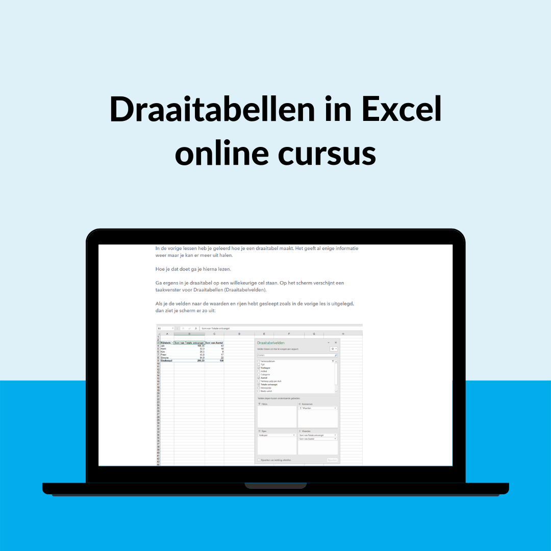 Draaitabellen zijn een krachtig hulpmiddel in Excel waarmee je snel en eenvoudig gegevens kunt berekenen, samenvatten en analyseren. Als je nog niet bekend bent met draaitabellen, mis je een van de meest efficiënte functies van Excel. Leer tijd te besparen door draaitabellen effectief in te zetten, voor een eenmalige investering van slechts €49 (vrijgesteld van BTW)