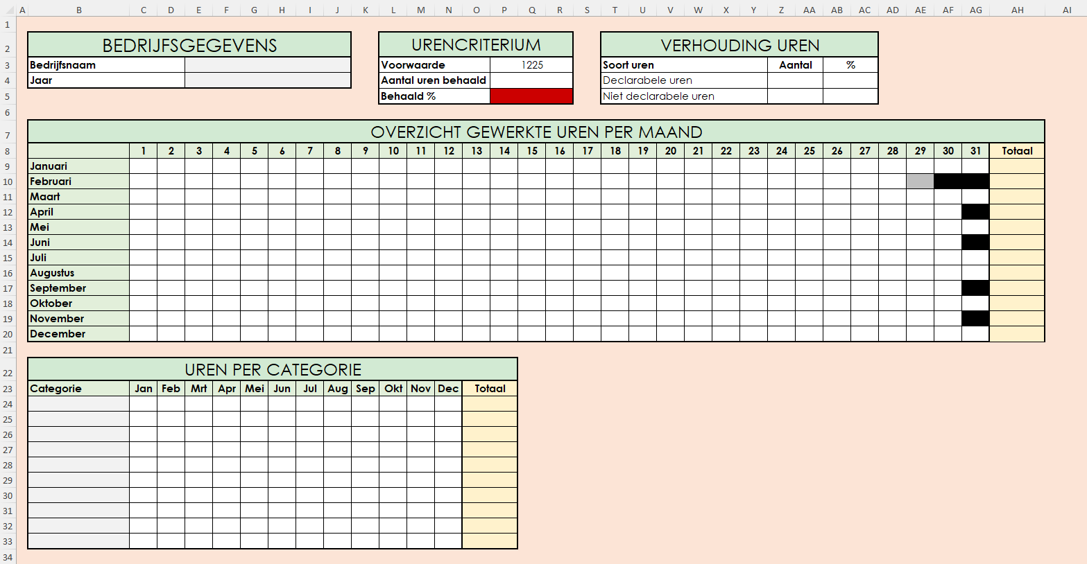 Iedere maand heeft zijn eigen werkblad waar je jouw uren in kunt bijhouden.