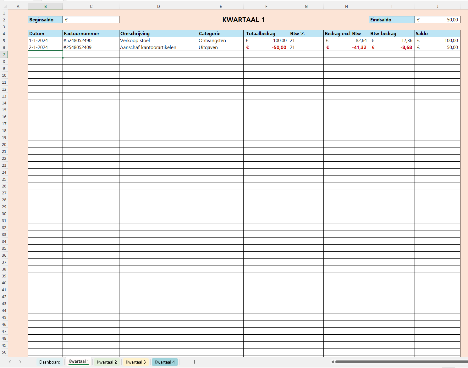 Zo ziet een werkblad van het het kasboek eruit waarbij je de inkomsten en uitgaven per kwartaal kunt invoeren: