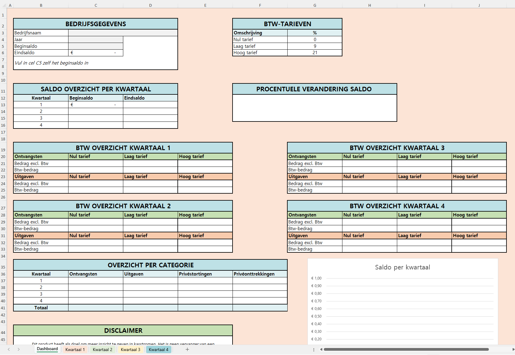 Kasboek: Twee varianten, één waarbij jouw inkomsten en uitgaven per kwartaal kunt invoeren en één waarbij je dit per maand kunt doen.